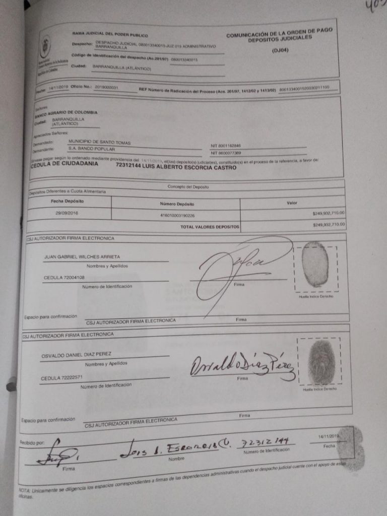 Tras su posesión el actual alcalde de Santo Tomás Guardiola Sarmiento solicitó información a los dos bancos en cuestión. La secretaría del Juzgado Quince Administrativo del Circuito de Barranquilla, respondió el 13 de febrero de este año que el título judicial número 416010003190226 había sido entregado al señor Luis Alberto Escorcia Castro mediante acta firmada el 14 de noviembre del 2019, acreditando su calidad de alcalde de Santo Tomás.