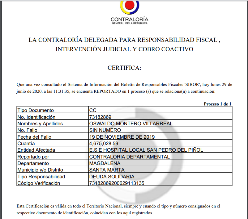 La sanción consistente en una deuda solidaria por $4,675,028.59 pesos se mantiene vigente según consta en el Certificado de Responsabilidad Fiscal expedido por la Contraloría y que es uno de los documentos exigidos por las entidades estatales para contratar a cualquier persona natural o jurídica.