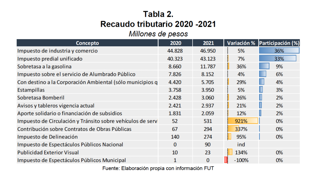 El crecimiento del recaudo tributario obedeció al aumento generalizado de todos los tributos del distrito, destacándose el buen desempeño de ICA, predial y sobretasa a la gasolina (Tabla 2).