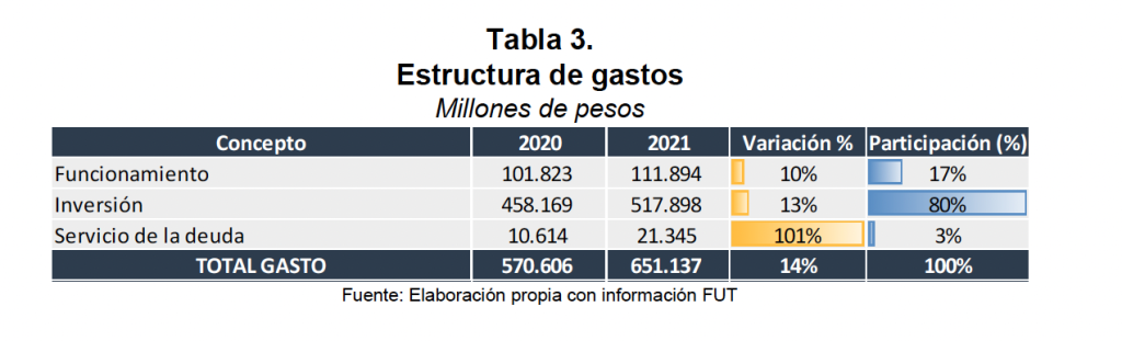 Al finalizar la vigencia 2021, el distrito comprometió recursos por $651.137 millones. Del total de gasto, el 80% estuvo orientado a gastos de inversión, 17% a funcionamiento y 3% para el pago del servicio de la deuda (Tabla 3).