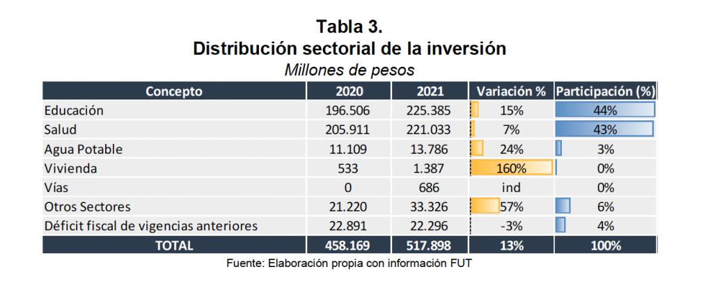 La inversión mostró un aumento de doble digito entre 2020 y 2021. Los sectores más representativos son educación y salud, los cuales a su vez están financiados casi en su totalidad con recursos del SGP.