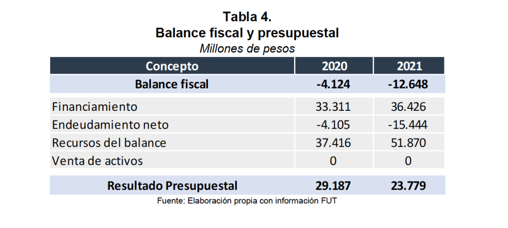 Al tener en cuenta los recursos del balance y el endeudamiento neto, la entidad consolidó un superávit presupuestal por $23.779 millones (Tabla 4).