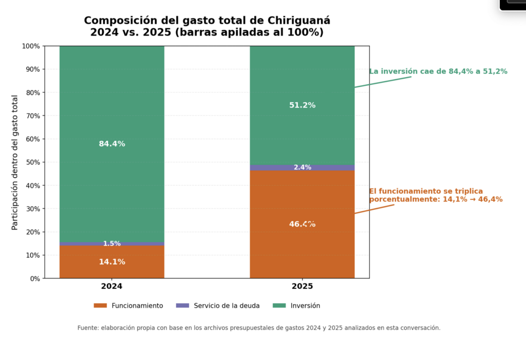 Interpretación forense: Chiriguaná sufre de una fuerte dependencia de transferencias (SGP y otros), aportando ingresos propios marginales (~18-19%). El dato más alarmante es el desplome absoluto de la inversión en 2025 (de 43,3 mil millones a 8,7 mil millones) y la parálisis en la ejecución de regalías, explicable posiblemente por el vacío de poder y la elección atípica, lo que impacta directamente el cumplimiento de las metas del Plan de Desarrollo.