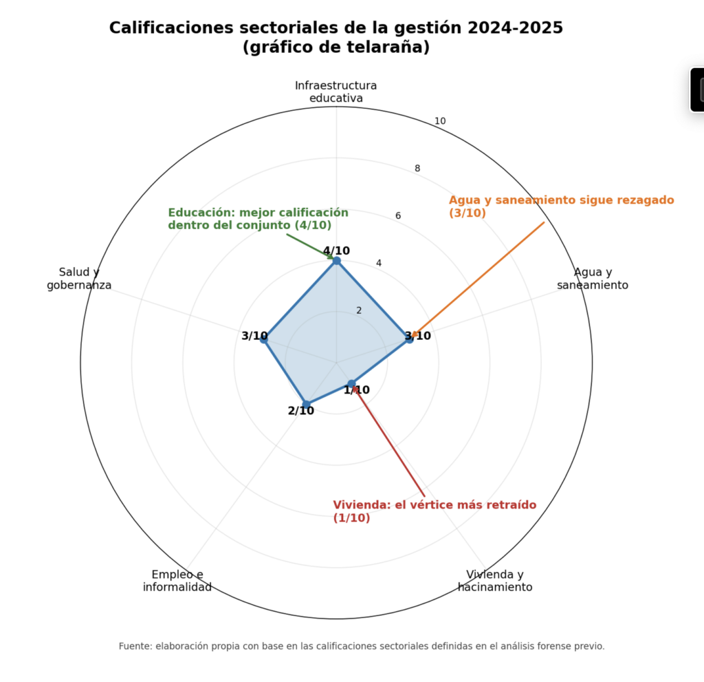 | Empleo e Informalidad | Dinámica de contratación local y fomento | Informalidad 87,4% | Contratación CPS en 2024 (635) dinamizó burocracia, pero colapso de inversión en 2025 frenó el empleo formal en obras. | 4,0 |