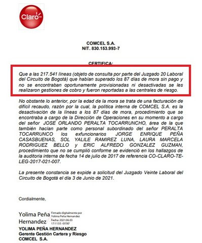 Claro le dijo a La Silla Vacía que ese proceso «no generó perjuicios a los usuarios», pero en el Juzgado 20 Laboral de Bogotá envió certificaciones en las que queda prueba de lo contrario.