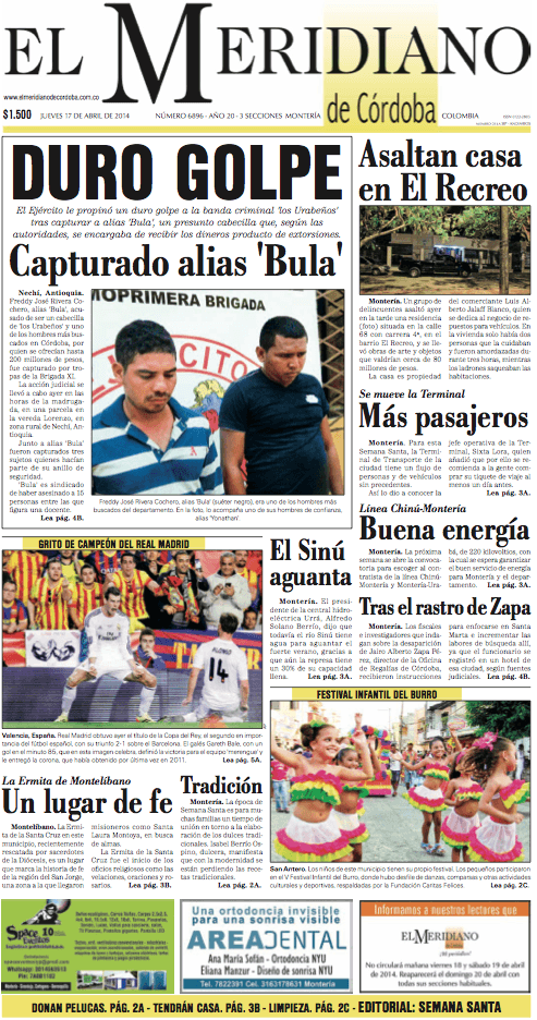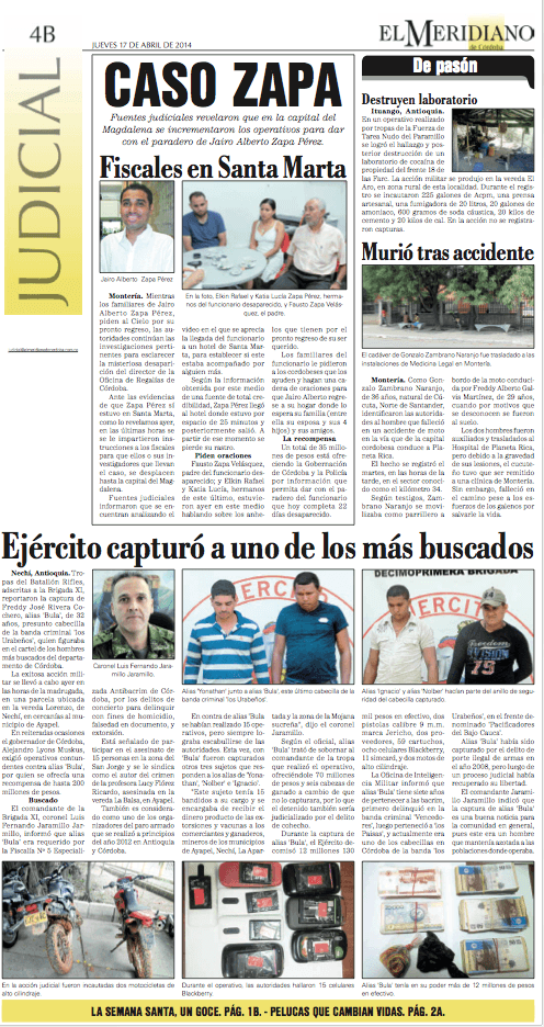 - Jairo Alberto Zapa Pérez desapareció el 27 de marzo de 2014. Veintidós días después de su desaparición en circunstancias extrañas que aún no han sido aclaradas, el diario Meridiano de Córdoba, el jueves 17 de abril de 2014, publica una noticia esperanzadora para la familia Zapa: “Tras el rastro de Zapa”.
