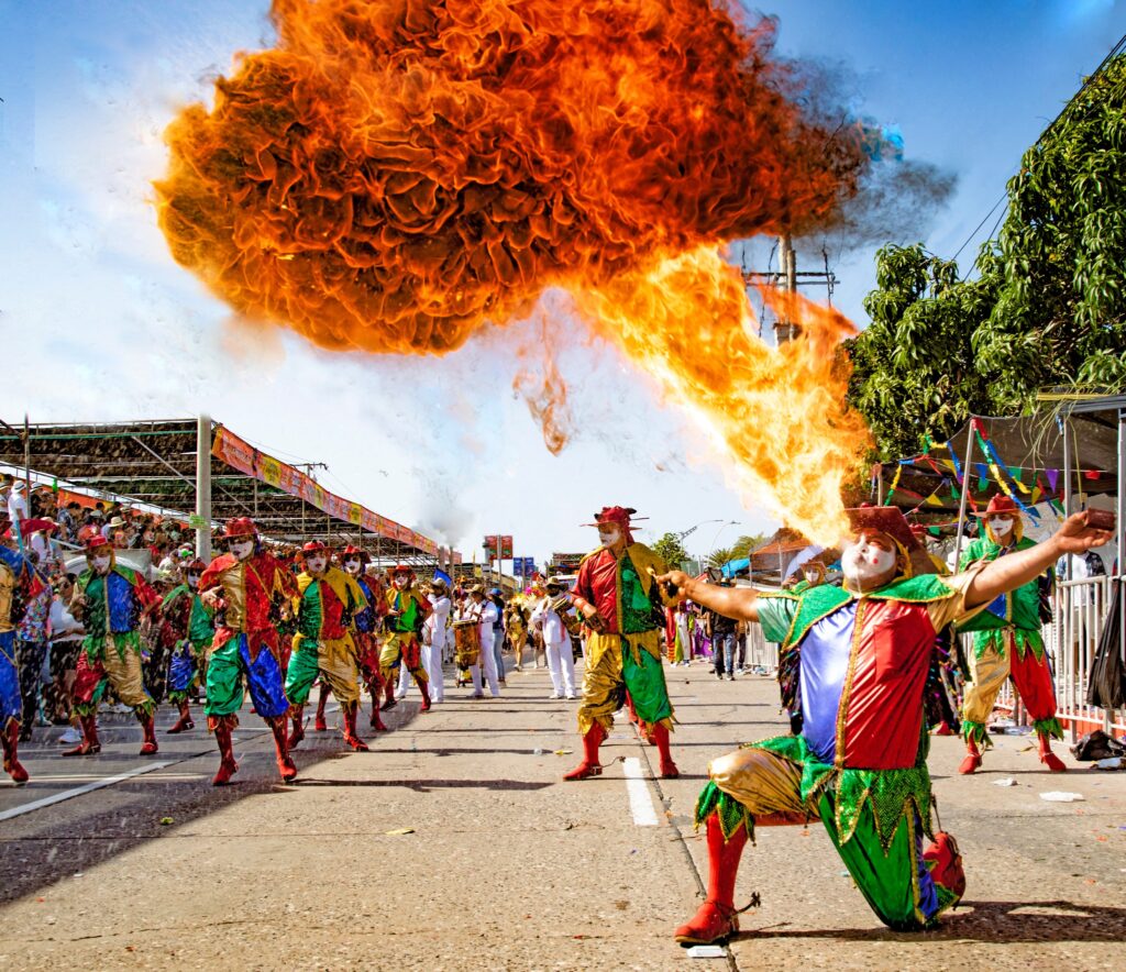 Germán Álvarez, director de la cumbiamba La Gigantona, no ha visto ni un centavo de eso. Ni él ni los 130 miembros de su comparsa. Ellos bailan a pleno sol por los 4 kilómetros de la vía 40, en zapatos hechos con suelas de neumáticos. Felices. Sonriéndole a los lujosos palcos que los enmarcan, atiborrados de turistas que pagaron hasta 400 mil pesos para ir a verlos.