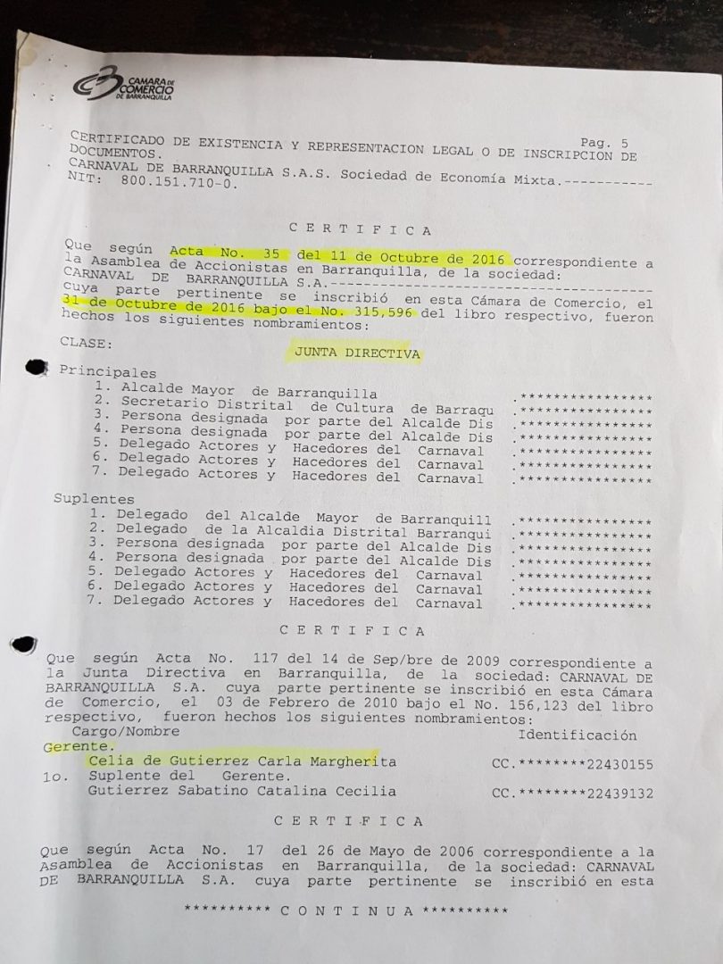 - Hábilmente, también al montar la sociedad por acciones simplificada (S.A.S), los socios se retiraron de la junta directiva y colocaron al Distrito con 8 cupos (cuatro principales y cuatro suplentes) y a los Actores y Hacedores del carnaval con 6 cupos (6 principales y 3 suplentes). Ver imagen del Certificado de Registro Mercantil del 9 de noviembre de 2016.