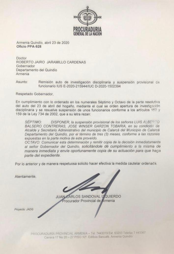 La Procuraduría Provincial de Armenia (Quindío) suspendió, de forma provisional, al alcalde del municipio de Calarcá, Luis Alberto Balsero Contreras; a su secretario administrativo, José Winser Garzón Tobaria; y otros funcionarios, por alterar presuntamente contratos relacionados con la compra de mercados para atender la emergencia de la pandemia en la localidad.