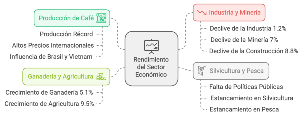 - Ganadería y agricultura: Crecieron un 5.1% y un 9.5%, respectivamente, mientras que sectores como la silvicultura y la pesca permanecen rezagados debido a la falta de políticas públicas.