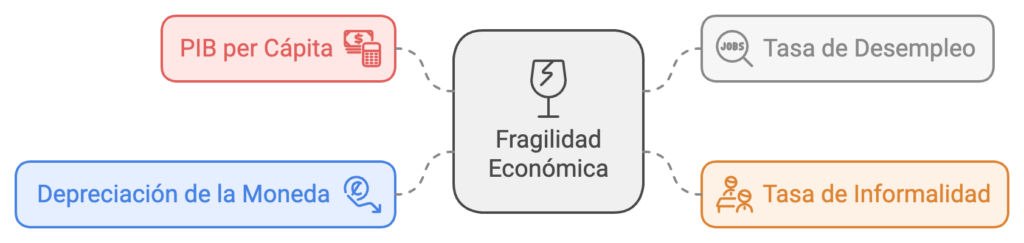 El PIB per cápita en dólares es uno de los más bajos de la región, ubicándose en USD 4,280. Además, la tasa de desempleo supera el 10%, mientras que la informalidad afecta al 56% de la población trabajadora. Estos indicadores, combinados con una depreciación del peso del 13.7% en lo que va del año, subrayan la fragilidad económica.