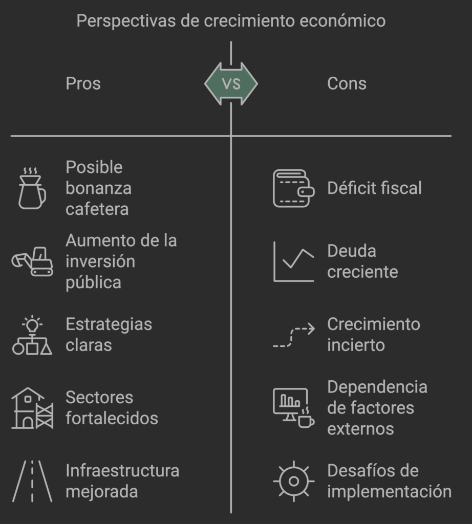 Con un déficit fiscal proyectado del 5.6% y el endeudamiento creciente, alcanzar la meta del 1.8% de crecimiento anual parece improbable. No obstante, factores como una posible bonanza cafetera y una mayor inversión pública podrían mejorar las perspectivas para 2025, siempre y cuando se implementen estrategias claras que fortalezcan sectores como la construcción, la infraestructura y el comercio.