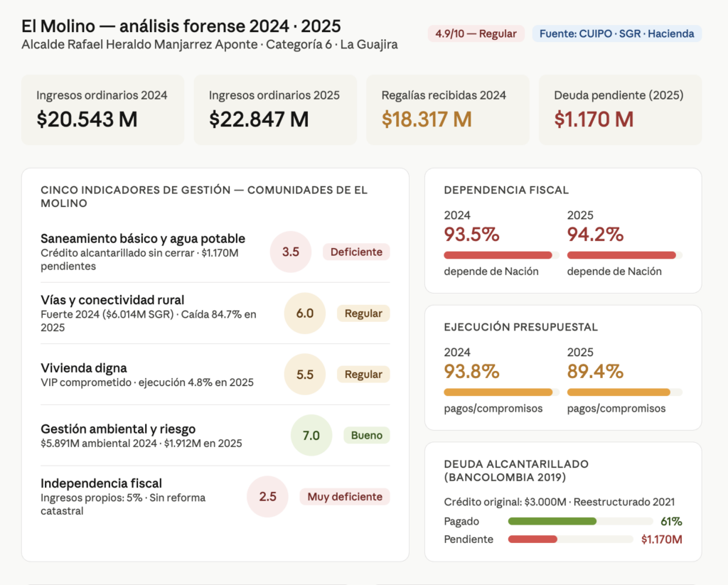 La Guajira tiene un NBI (Necesidades Básicas Insatisfechas) que en zona rural supera el 70%. El Molino es un municipio categoría 6, el escalón más bajo de la categorización municipal colombiana, lo que significa recursos limitados pero también responsabilidades básicas que no pueden incumplirse. El problema no es que El Molino sea pobre. El problema es que los mecanismos de dependencia fiscal están tan arraigados que ningún alcalde ha sentido el incentivo real de reformar el sistema tributario local.