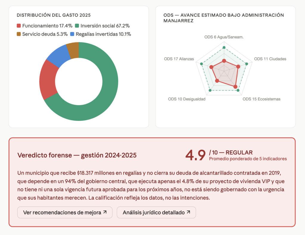 El crédito con Bancolombia para la optimización del sistema de alcantarillado sanitario, firmado en noviembre de 2019, reestructurado en octubre de 2021, con monto aprobado de $3.000 millones y un plazo de 84 meses (7 años), muestra un saldo pendiente al cierre de 2025 de $1.170 millones. En los dos años de la administración Manjarrez, el municipio pagó amortizaciones por $458.7 millones en 2024 y $434.9 millones en 2025. Eso es cumplimiento del servicio de deuda, lo cual es positivo. Pero la garantía de ese crédito es el SGP de propósito general con un porcentaje de pignoración del 130%, lo que significa que el municipio está hipotecando su principal fuente de transferencias libres para pagar una deuda que debería haber resuelto el problema del alcantarillado hace años. ¿Y el alcantarillado? Los registros oficiales de ejecución no muestran reportes de avance en cobertura ni indicadores de calidad de agua en el municipio para los años 2024 y 2025.