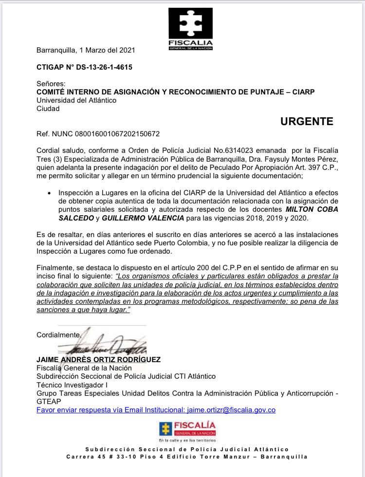 Al parecer, la Fiscalía General de la República está dispuesta a escarbar en algunos frentes de la vasta corrupción que carcome todos los estamentos de la universidad del Atlántico. Así lo confirmó corrupcionaldia.com, al conocer una comunicación de la Subdirección de Policía Judicial CTI Atlántico al Comité Interno de Asignación y Reconocimiento de Puntaje CIARP de este centro de estudios superiores.