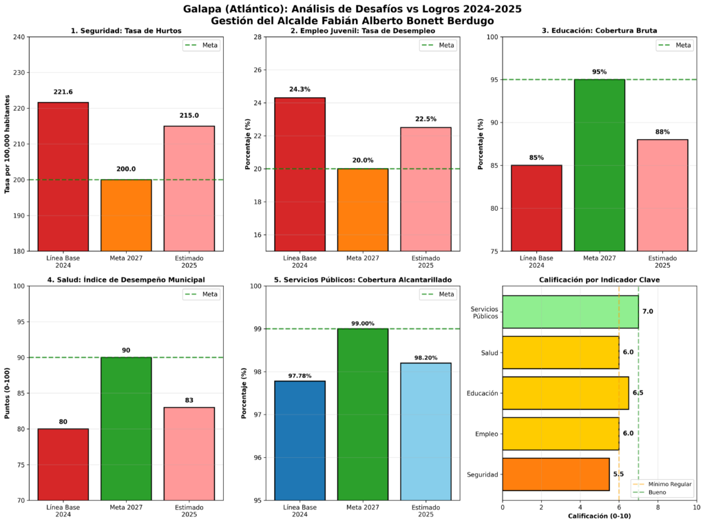 La gestión del alcalde Fabián Alberto Bonett Berdugo durante 2024-2025 puede caracterizarse como REGULAR, con avances significativos en educación superior y servicios públicos, pero con deficiencias críticas en seguridad ciudadana y empleo juvenil.
