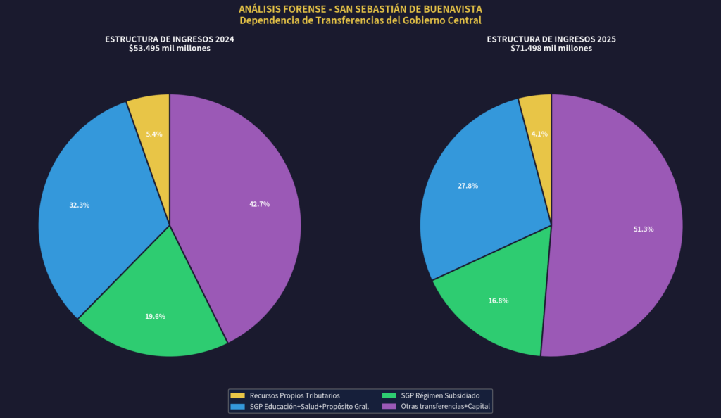 La dependencia de transferencias bajó de 92.1% (2024) a 82.3% (2025), pero NO porque el municipio mejorara su recaudo propio. Los ingresos totales subieron $18 mil millones gracias a: