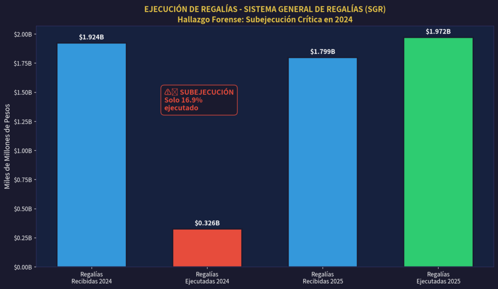 En 2024, el municipio recibió $1.924.278.466 del Sistema General de Regalías. Solo ejecutó $325.600.000 (16.9%).