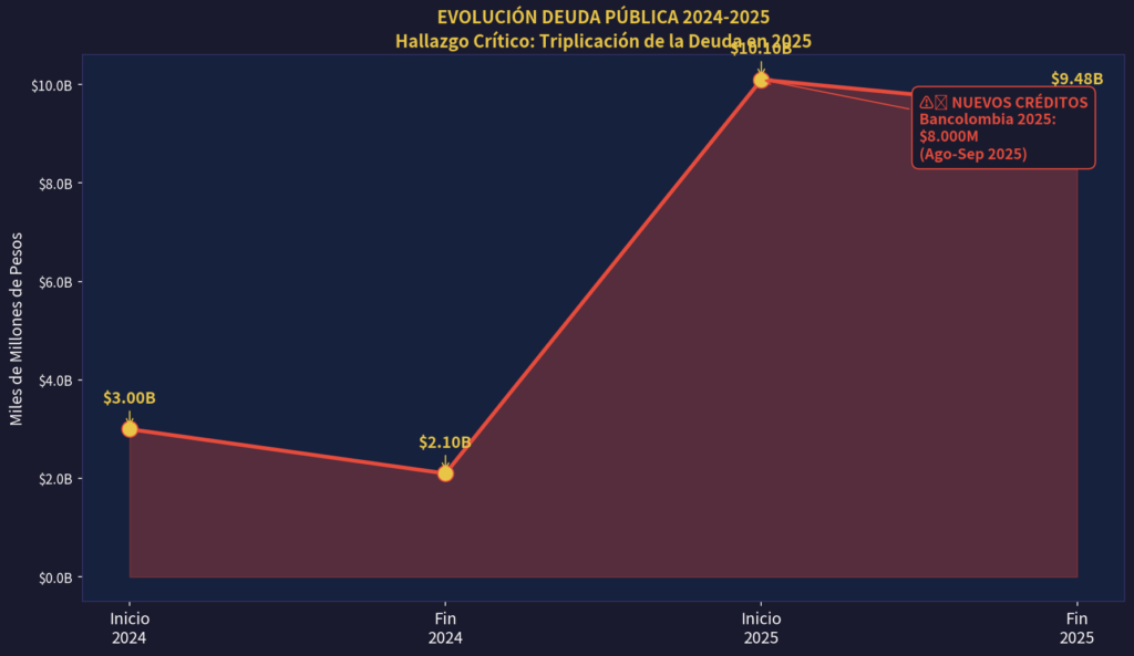 En septiembre de 2025, el alcalde adquirió DOS créditos con Bancolombia por $8.000 millones, incrementando la deuda municipal en un 351% en un solo año.
