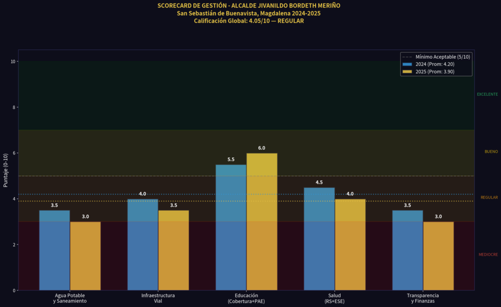 El alcalde Jivanildo Bordeth Meriño cierra sus dos primeros años de gobierno (2024-2025) en San Sebastián de Buenavista con una gestión que la ciudadanía y las cifras califican como REGULAR, con preocupante tendencia descendente.