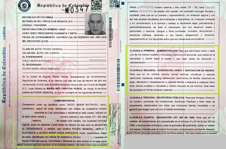 Este poder general no es cualquier trámite burocrático: permite a Arias Arboleda administrar «todos y cada uno de los bienes muebles e inmuebles, derechos y/o acciones» del poderdante, además de representarlo en la adquisición, venta y disposición de bienes, así como en escrituras públicas relacionadas con trámites inmobiliarios.