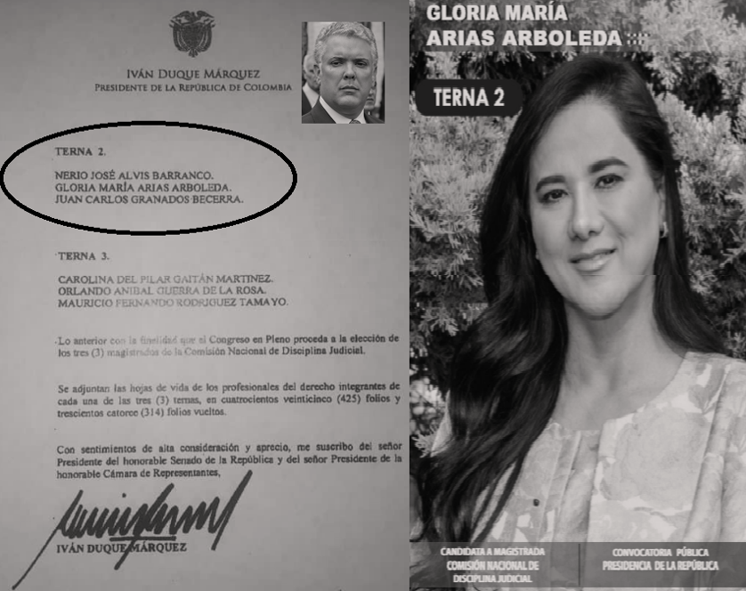 El segundo documento expone un aspecto aún más revelador: Gloria María Arias Arboleda aparece en la «Terna 2» presentada por el entonces presidente Iván Duque Márquez para integrar la Comisión Nacional de Disciplina Judicial. Esta designación no es casual y plantea serias interrogantes sobre la separación de poderes y los criterios de selección para organismos que deben garantizar imparcialidad.