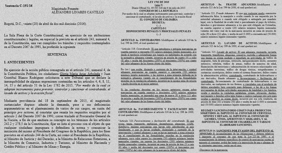 El tercer documento, una sentencia de la Corte Constitucional (C-191/16), revela otro capítulo crucial: Gloria María Arias Arboleda, junto a Cristobal Blanco Rodríguez, presentó una acción pública solicitando la declaración de inexequibilidad de normas destinadas a «prevenir, controlar y sancionar el contrabando, el lavado de activos y la evasión fiscal».
