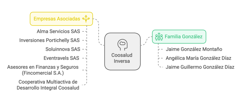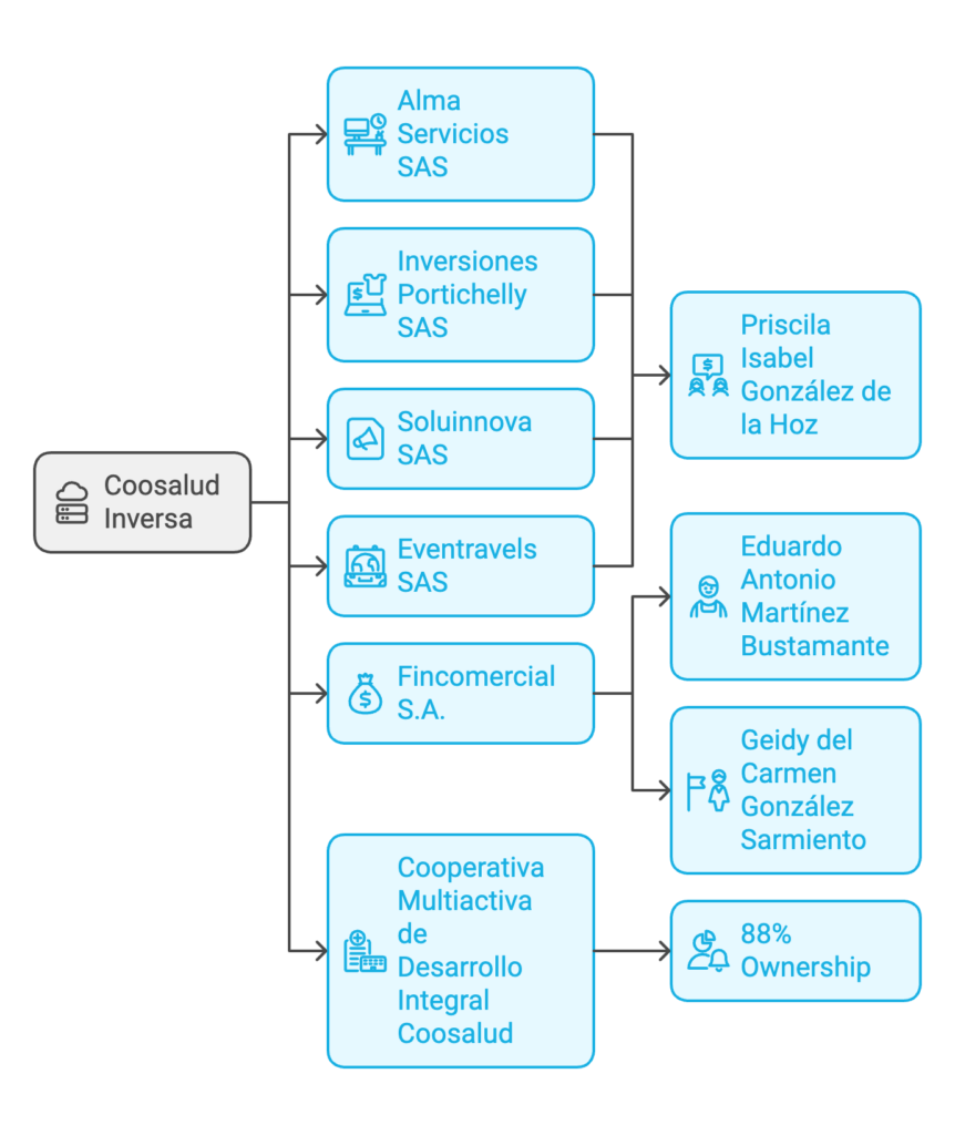 El apellido González se repite. Como socios minoritarios de la firma investigada por el gobierno con un 0,5 por ciento una, aparecen: Alma Servicios SAS (dedada a servicios administrativos de oficinas); Ines Portichelly SAS (dedicada a la confección de prendas de vestir); Soluinnova SAS (comercio al por mayor de computadores); y Eventrav SAS (operadores turísticos), todasadas por Priscila Isabel González de Hoz. El único dueño de estas empresas es la Cooperativa de Desarrollo Integral Coosalud, que es diferente a la EPS. Con el 10% de las acciones de Coosalud Inversa la empresa Asesores en Finanzas y Seguros (Fincomercial S.A.), representada por Eduardo Antonio Martínez Bustamante y Geidy del Carmen González Sarmiento.