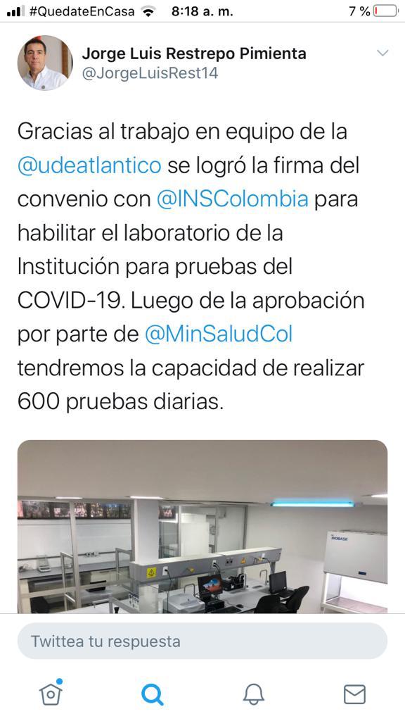 Desde el inicio de la crisis originada por el avance de la pandemia de Covid-19 en nuestro país, el rector de la universidad del Atlántico, Jorge Luis Restrepo Pimienta, ha estado publicitándose por todos los medios ofreciendo el laboratorio de la institución educativa para realizar las pruebas de coronavirus, tanto a la gobernación como al gobierno nacional.