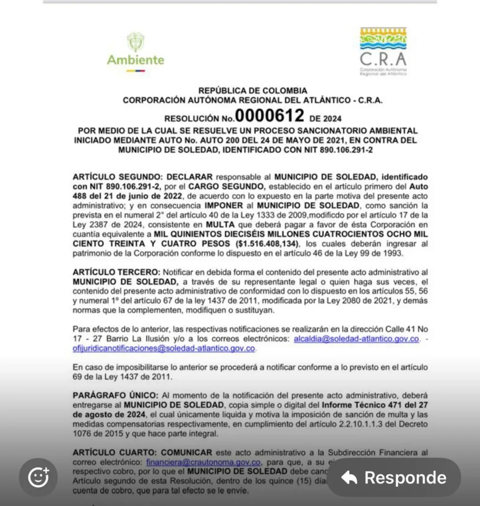 La resolución de la CRA es contundente: «DECLARAR RESPONSABLE al MUNICIPIO DE SOLEDAD por el CARGO SEGUNDO… IMPONER al MUNICIPIO DE SOLEDAD una MULTA de MIL QUINIENTOS DIECISÉIS MILLONES CUATROCIENTOS OCHO MIL CIENTO TREINTA Y CUATRO PESOS ($1.516.408.134)».