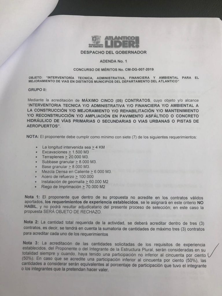 Se trata del concurso de méritos No. CM-DG-007-2019, cuyo objeto es la Interventoría técnica, administrativa, financiera y ambiental para el mejoramiento de vías en distintos municipios del departamento del Atlántico, por un valor de $2.800.000.000.