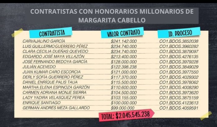 La procuradora Margarita Cabello se gasta más de $2.000.000.000 millones de pesos en 14 asesores para archivar las investigaciones de sus amigos y perseguir a sus contradictores políticos, de acuerdo a las siguientes cifras: