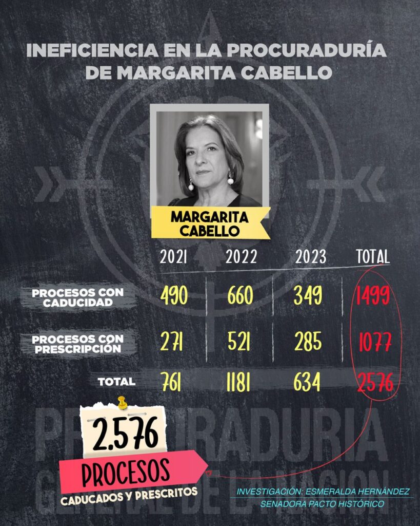 Con más de 4.100 funcionarios a su cargo, Margarita Cabello ha dejado CADUCAR 1.499 procesos y PRESCRIBIR 1.077 procesos para un total de 2.576 vencidos. No solo nos vale una millonada la Procuraduría General, sino que es altamente ineficiente.