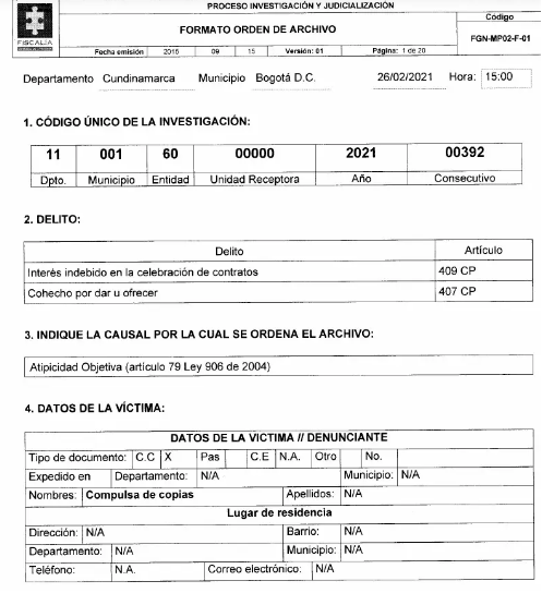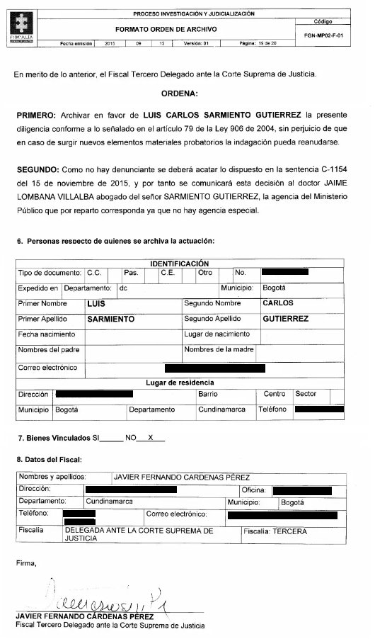 El Fiscal Javier Fernando Cárdenas archivó el caso el 26 de febrero de 2021, cerrándole la investigación al hijo de Luis Carlos Sarmiento por los delitos de «interés indebido en la celebración de contratos» y «cohecho por dar u ofrecer» en el caso Odebrecht.