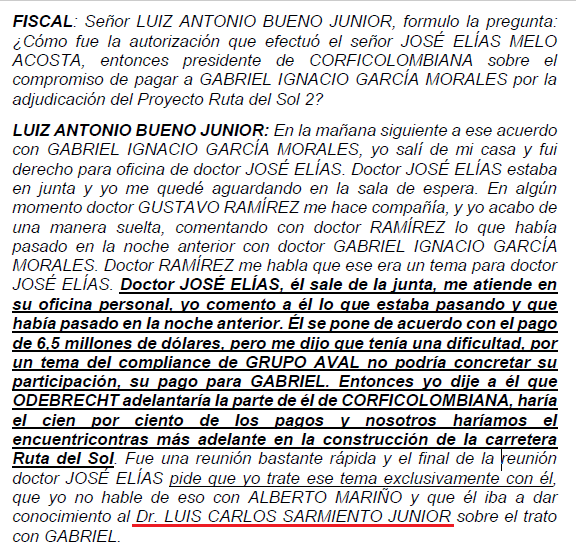 Hay un testimonio de Luis Bueno Junior que señala que Luis Carlos Sarmiento (hijo) conocía de sobornos para obtener el contrato de la Ruta del Sol II entre Odebrecht y Corficolombiana del Grupo Aval. José Elías Melo Presidente de Corficolombiana se lo habría comunicado.