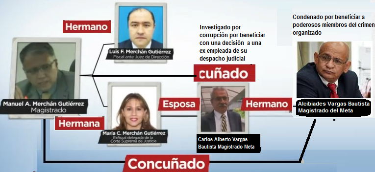 Las conexiones familiares de Manuel Antonio Merchán se extienden más allá de su hermana. En 2017, mientras se revelaba el escándalo del «cartel de la toga» en la Corte Suprema, estalló otro caso en Villavicencio: tres magistrados del Tribunal —Fausto Rubén Díaz, José Darío Trejos y Alcibíades Vargas— fueron señalados de manipular procesos judiciales a cambio de dinero para favorecer a criminales.