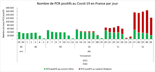 El siguiente gráfico representa el número de pruebas PCR positivas para Ómicron o Delta durante las últimas 5 semanas de 2021.