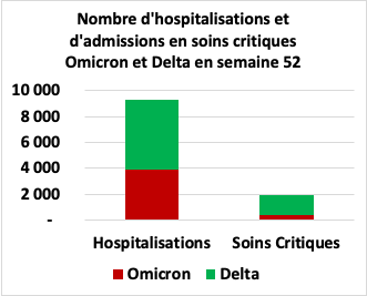 | En conclusión, dadas las cifras de hospitalizaciones y admisiones a cuidados intensivos, Omicron tiene todas las posibilidades de aliviar la congestión en nuestros hospitales más rápido que 18 meses de política de vacunación. De hecho, Ómicron es: → 4,4 veces menos probabilidad de ser hospitalizado en comparación con Delta; → Una estancia hospitalaria inferior a 1 día en el 43% de los casos frente al 19% de los afectados por la variante Delta; → Y una probabilidad de entrar en cuidados críticos 3 veces menor que en pacientes Delta. |
