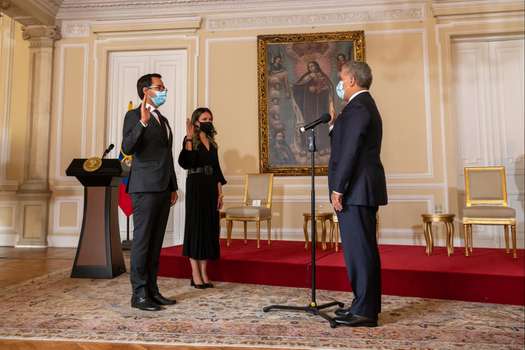 Lisandro Junco Riveira (director de la Dian) y Goethny Fernanda García (superintendente de Notariado y Registro) tomando juramento ante el presidente Iván Duque.