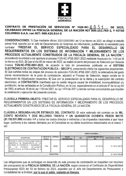 El contrato fue suscrito por $1.192 millones de pesos con el objeto de «prestar un servicio especializado para mejorar los procesos y cumplir requerimientos en los sistemas tecnológicos de información de la Fiscalía General de la Nación», con un plazo de 8 meses para su ejecución.