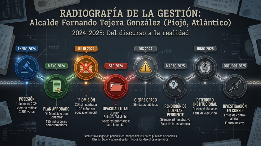 Fernando Rafael Tejera González llegó a la alcaldía de Piojó en enero de 2024 tras una elección reñida que lo obligaba moralmente a demostrar con hechos que merecía el cargo. Dos años después, la realidad es que las grandes transformaciones prometidas siguen siendo promesas incumplidas.