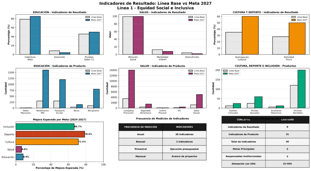Propósito: Crear un municipio donde la inversión social efectiva garantice acceso a educación de calidad, salud como prioridad, seguridad alimentaria, expresiones culturales, espacios para deporte y recreación, y plena inclusión de poblaciones vulnerables (niños, niñas, adolescentes, jóvenes, mujeres, personas en situación de discapacidad, adultos mayores, etnias, comunidad LGBTIQ+, víctimas del conflicto).
