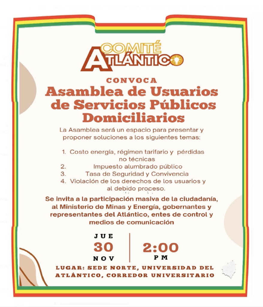 Este jueves 30 de noviembre de 2023 se realizará la Asamblea de usuarios de servicios públicos domiciliarios, convocada por el Comité Atlántico, una organización que agrupa diferentes asociaciones que han venido luchando en distintos frentes contra los abusos y malos manejos de los servicios públicos en Barranquilla y el Atlántico.