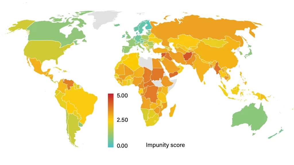 Colombia, en el puesto 53, obtuvo un escore de 2.79; mientras que el número 1, el país con más impunidad, es Afganistan con de 4.25. Vergonzoso desde todo punto de vista, gracias a la cantidad de funcionarios judiciales como el expresidente de la Corte Suprema de Justicia Camilo Humberto Tarquino.