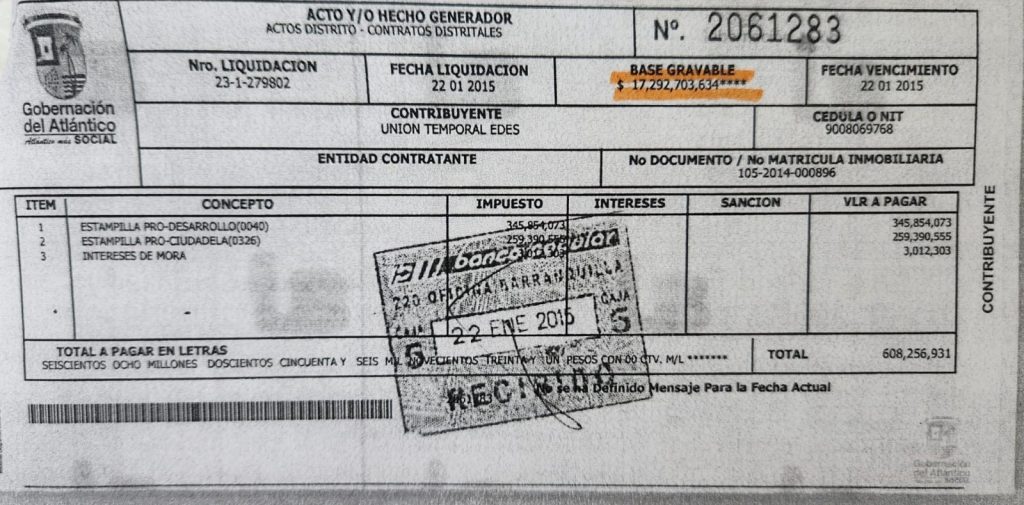 La copia del pago nos muestra que el monto total de estos impuestos fue $608.256.931. Pero aquí no terminan las cosas pues la Unión Temporal Edes, hasta el día de hoy no ha pagado los impuestos distritales.