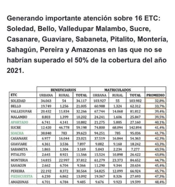 Para el caso de Soledad, la Contraloría advierte en su informe, que, del total de 103.982 niños registrados oficialmente como estudiantes de escuelas públicas -en el 2021- sólo hay registros de que la alcaldía haya prestado algún cuestionado servicio de alimentación a 34.117 niños, que corresponde a una cobertura del 32.8 por ciento.